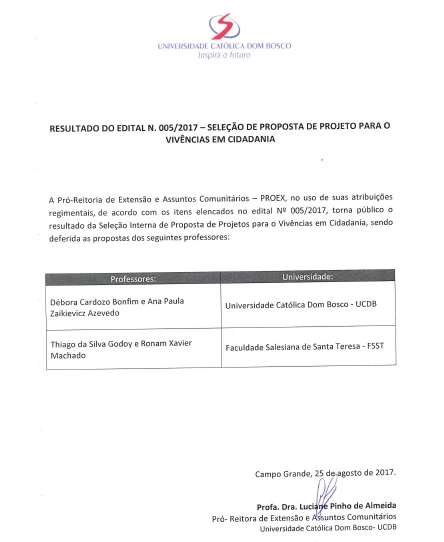 De acordo com os itens elencados no documento, foram deferidas as propostas dos seguintes professores: Débora Cardozo Bonfim e Ana Paula Zaikievicz Azevedo da Universidade Católica Dom Bosco (UCDB) e Thiago da Silva Godoy e Ronam Xavier Machado da Faculdade Salesiana de Santa Tereza (FSST).
