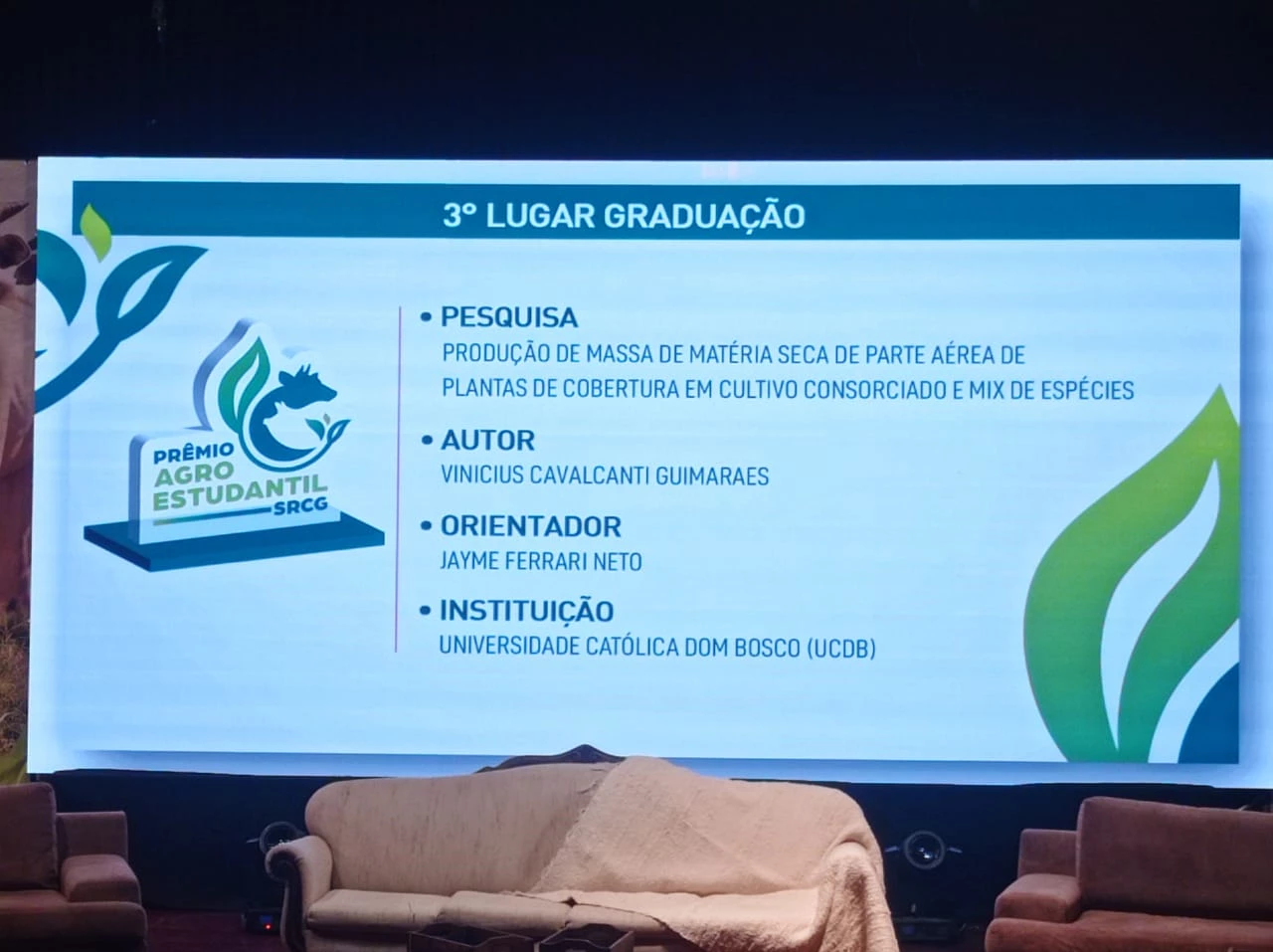 A pesquisa “Produção de massa de matéria seca de parte aérea de plantas de cobertura em cultivo consorciado e mix de espécies”, de autoria do acadêmico do 9º semestre de Agronomia da Universidade Católica Dom Bosco Vinícius Cavalcanti Guimarães, orientado pelo professor Jayme Ferrari Neto, classificou-se em 3º lugar no Interagro 2023, categoria Agroestudantil, no último sábado (24), em Campo Grande. O estudo foi desenvolvido com apoio dos estudantes do laboratório de extensão Vivência em Ciências Agrárias e é o resultado do Trabalho de Conclusão de Curso (TCC) de Vinícius.