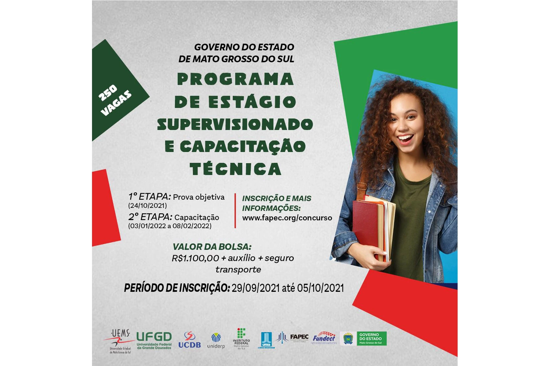 O governo de Mato Grosso do Sul lançou edital para contratar 250 estagiários, de diversos cursos de graduação, nas secretarias e autarquias estaduais. As inscrições seguem abertas até 5 de outubro. Os estudantes irão passar por um processo seletivo com prova escrita e capacitação.