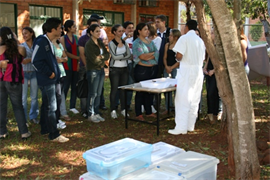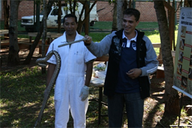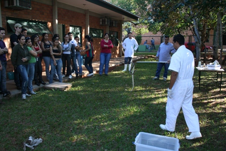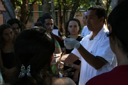 Os alunos do 3º ano do curso começaram a visita pelo setor interno do Biotério, sempre sob supervisão de profissionais da área. Do lado de fora, uma surpresa os aguardava: serpentes de várias espécies foram expostas para o melhor entendimento dos animais, como identificação do sexo e características das dentições. A acadêmica Silvia Gomes relatou a importância de participar de atividades interativas como esta: “Tudo isso só tem a enriquecer o nosso estudo, pois na prática conseguimos aprender muito mais do que na teoria”, disse.