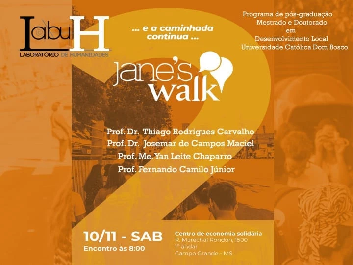 A 2ª edição da caminhada Jane's Walk, promovida pelo Me. Fernando Camilo de Carvalho Junior, docente do curso de Arquitetura e Urbanismo da Universidade Católica Dom Bosco (UCDB) acontecerá no próximo sábado (10), às 8h, no Centro de Economia Solidária, localizado na Rua Marechal Rondon, 1500 – Centro.