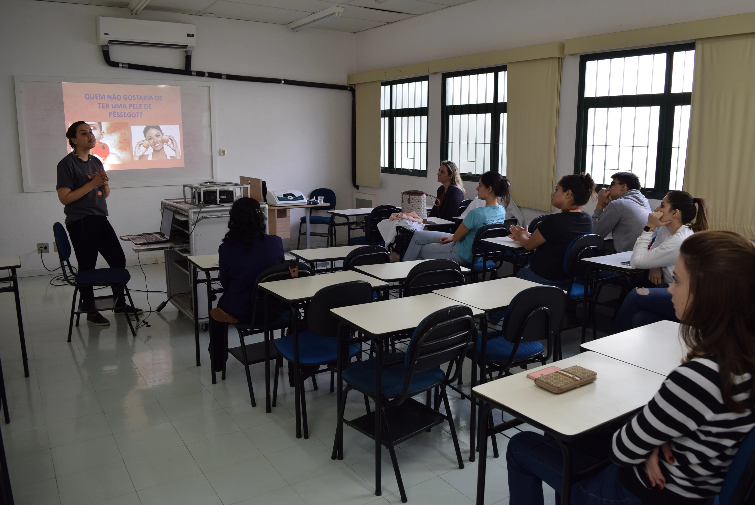 Acadêmicos do sétimo semestre do curso de Biomedicina da Universidade Católica dom Bosco (UCDB) prestigiaram nesta quinta-feira (2), em uma sala da Clínica-Escola, a palestra Radiofrequência Fácial, ministrada pela esteticista Flávia Remanachi. A atividade faz parte do estágio curricular da disciplina Biomedicina Estética.