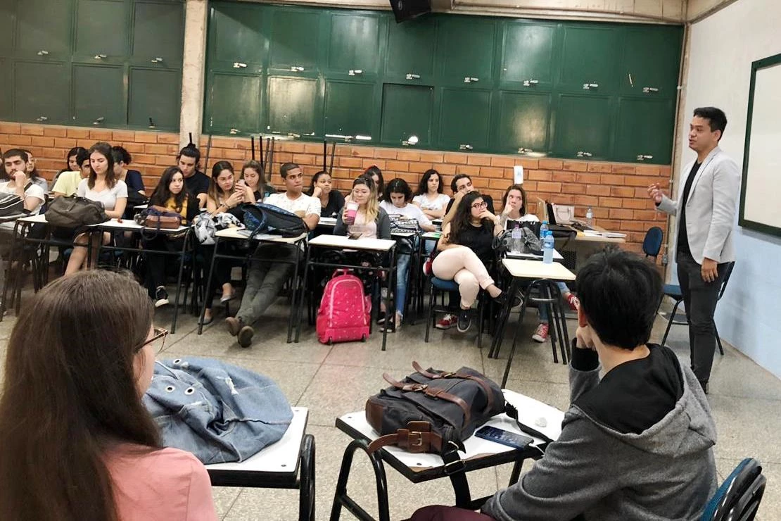 Nessa quarta-feira (4), acadêmicos do 2° e 4° semestre do curso de Comunicação Social (Jornalismo e Publicidade e Propaganda) da Universidade Católica Dom Bosco (UCDB) participaram de um bate-papo com o jornalista egresso da Instituição Alysson Maruyama. Atualmente, ele trabalha como repórter na TV Morena — Afiliada da Rede Globo em Mato Grosso do Sul — e conversou com os alunos sobre a trajetória profissional que traçou e também a respeito do mercado de trabalho na área.