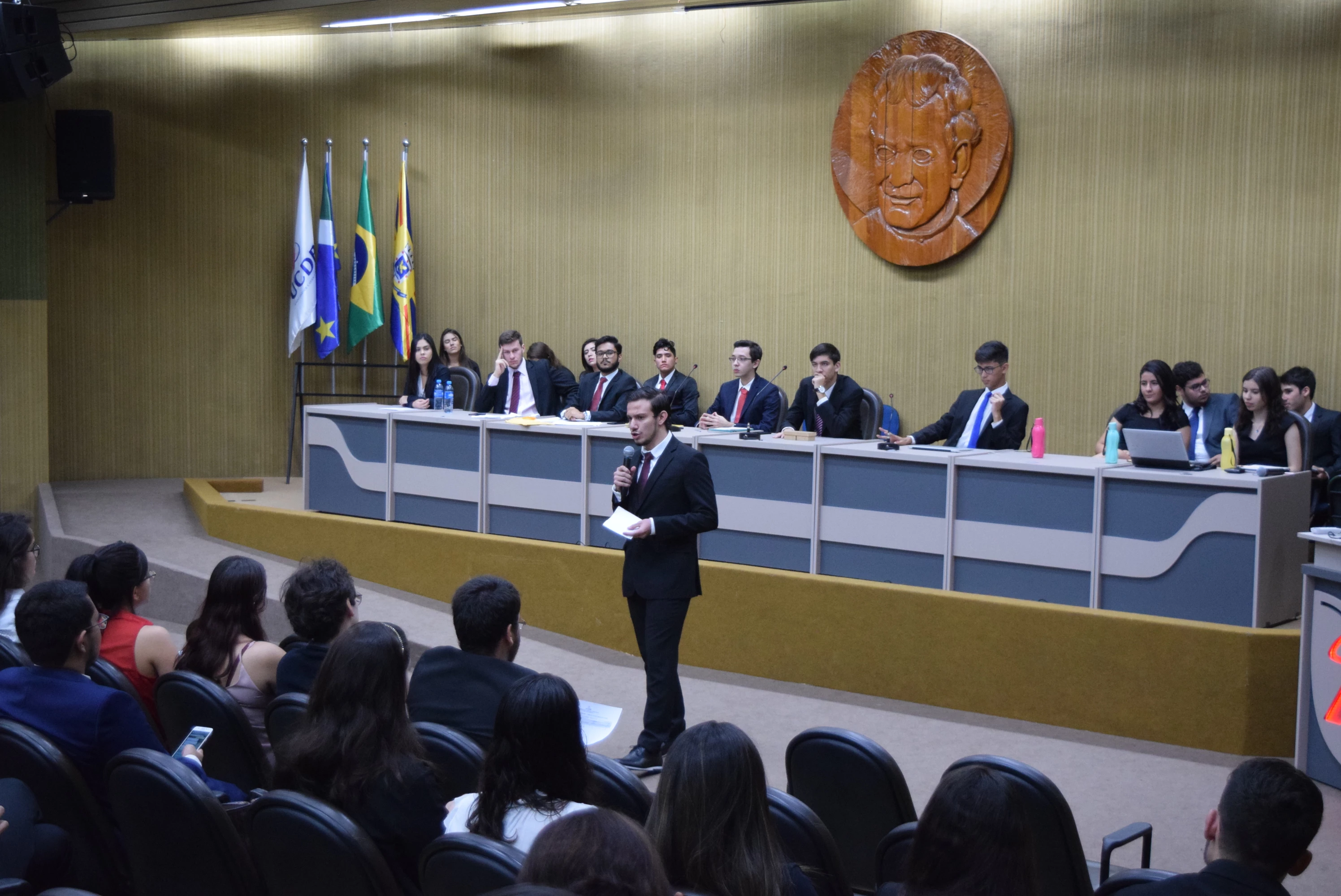 Acadêmicos do segundo semestre do curso de Direito da Universidade Católica Dom Bosco (UCDB), juntamente com a participação de acadêmicos do sexto e do sétimo semestre, participaram de um Tribunal de Argumentação, com os temas “Condução coercitiva” e “Cotas”. A atividade, que simula um julgamento real com promotoria e defensoria, faz parte da disciplina Redação e Linguagem forense.