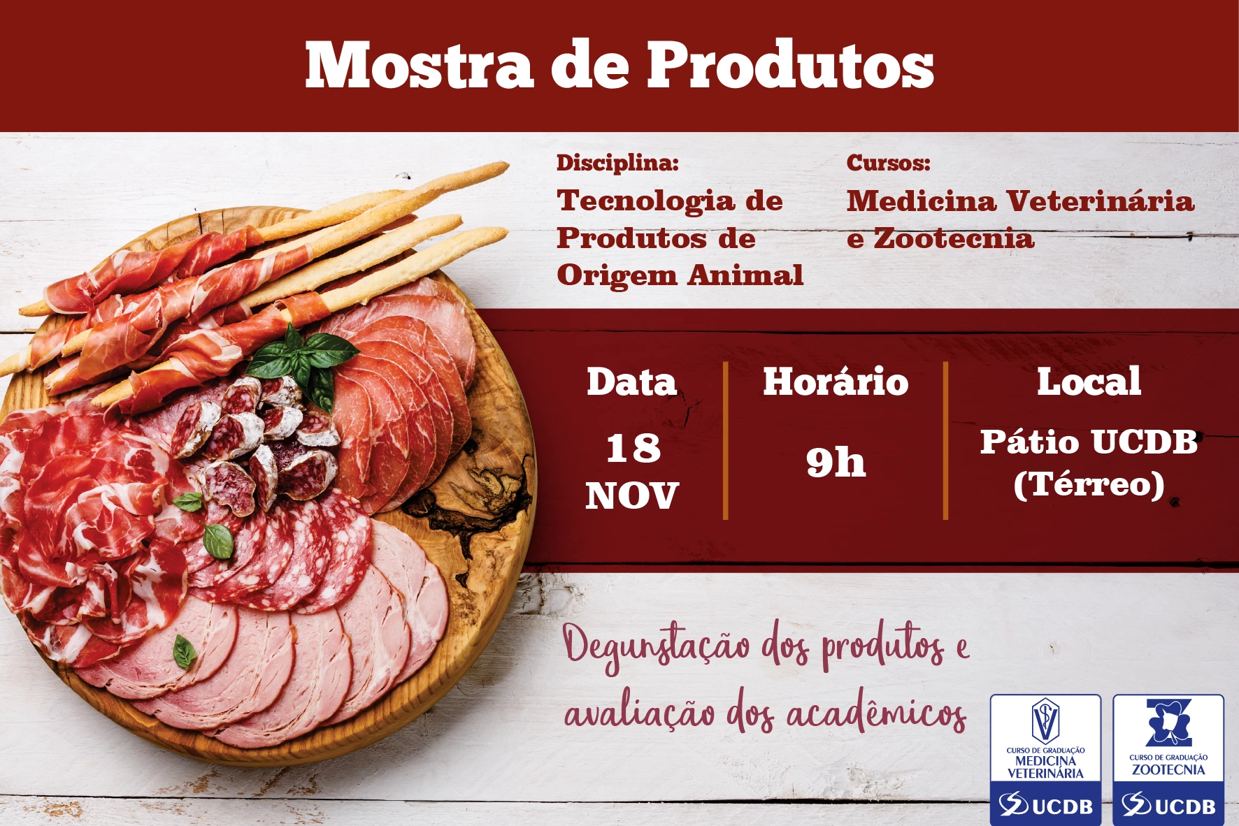 Acadêmicos de Medicina Veterinária e Zootecnia da Universidade Católica Dom Bosco (UCDB) realizam na próxima quinta-feira (18), a partir das 9 horas, a terceira edição da Mostra de Produtos, com degustação de alimentos derivados de carne, leite e mel. O evento será realizado no Pátio UCDB.