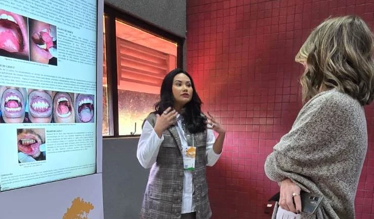 “A participação dos acadêmicos amplia o conhecimento pelo contato precoce com temas complexos. A Estomatologia e a Patologia constituem base essencial para entender doenças bucais e a influência de sistêmicas na boca. Participar de congressos também ajuda os alunos a visualizar como esse conhecimento será aplicado na prática clínica”, destacou a professora Tatiana Ferreira Robaina, que é especialista, mestre e doutora em Estomatologia e Patologia oral.