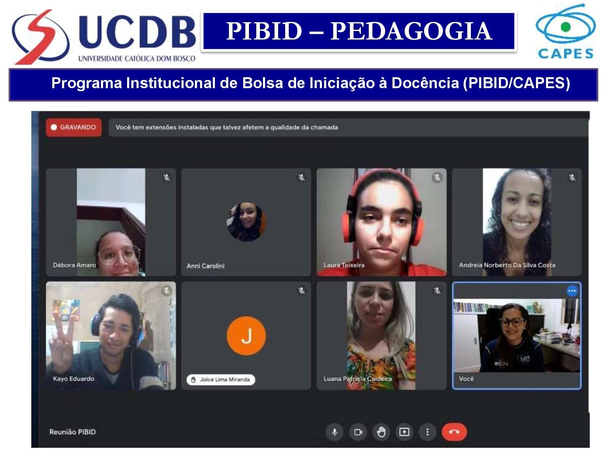 Os acadêmicos bolsistas do Programa Institucional de Bolsa de Iniciação à Docência (Pibid) da Universidade Católica Dom Bosco (UCDB), ligados ao curso de Pedagogia, participaram na semana passada (dia 7), de uma reunião on-line para avaliação do programa, referente ao primeiro semestre de 2021.