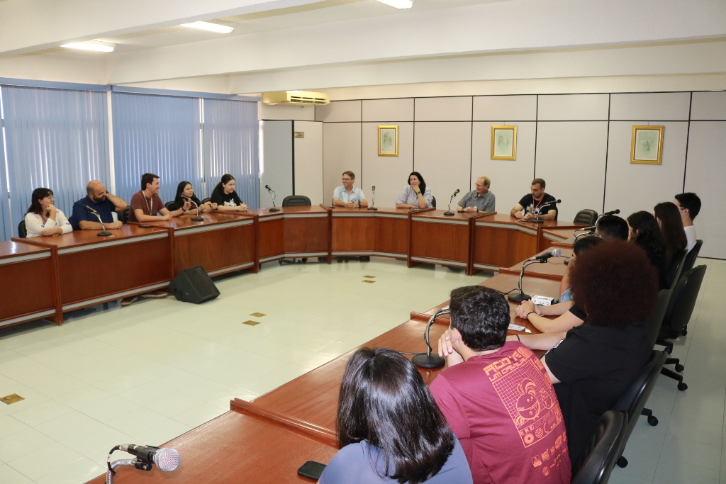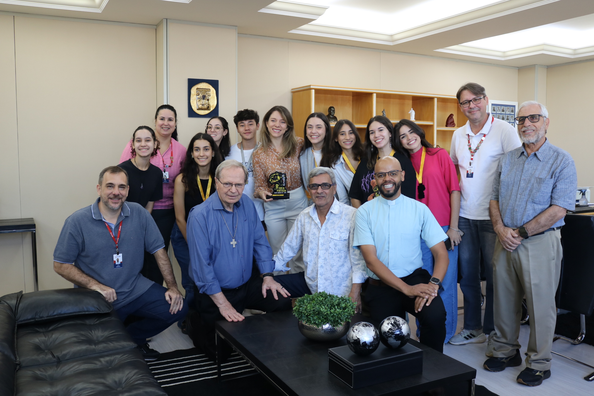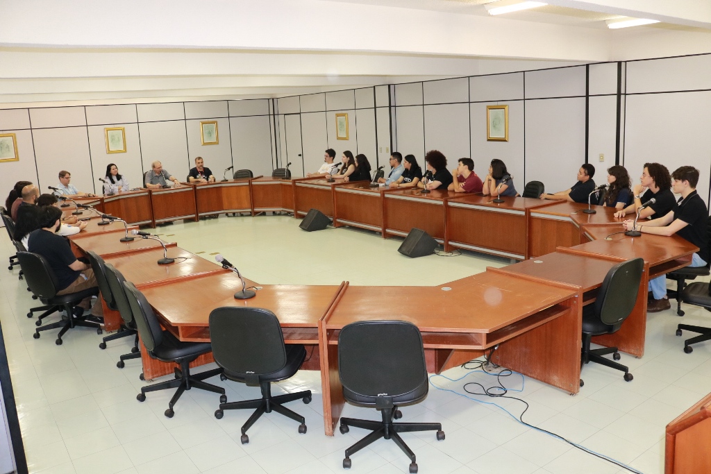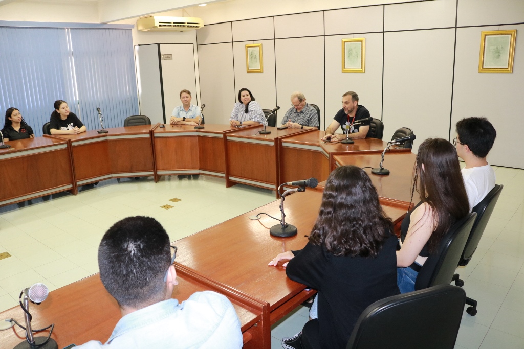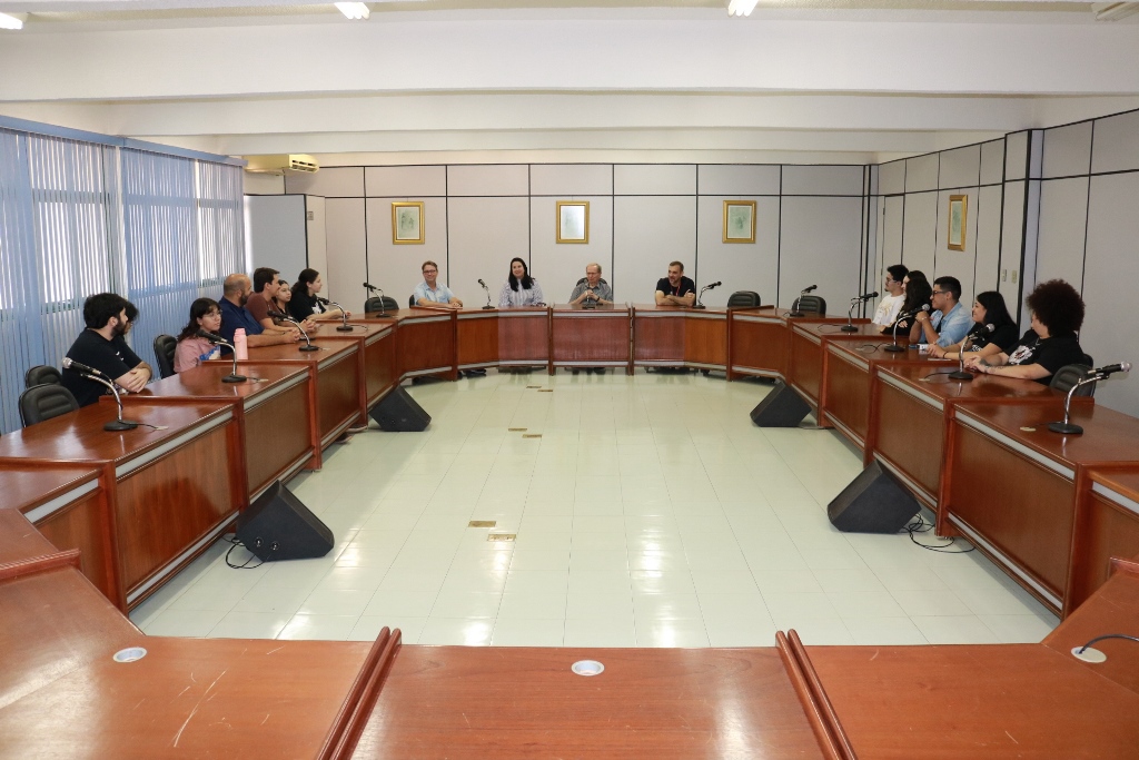 Acadêmicos premiados dos cursos de Publicidade e Propaganda, de Design e do grupo de dança Ararazul foram recebidos pelo Conselho de Reitoria. O encontro dos alunos de Comunicação aconteceu nesta manhã de segunda-feira (17), na sala Plenária do bloco Administrativo, com a presença do Reitor, Pe. José Marinoni, e os pró-reitores Taner Douglas Alves Bitencourt (Administração), Rúbia Renata Marques (Graduação e Extensão) e Cristiano Marcelo Espínola Carvalho (Pesquisa e Pós-graduação), além dos professores Elton Tamiozzo e Gabriel Ferraciolli. Alunos do primeiro semestre do curso de Publicidade conquistaram a 1ª colocação do Prêmio Morena categoria universitária, outros nove alunos venceram a categoria regional do Expocom realizado em Goiânia (GO) no início do mês, sendo sete do curso de Publicidade e dois do curso de Design).
