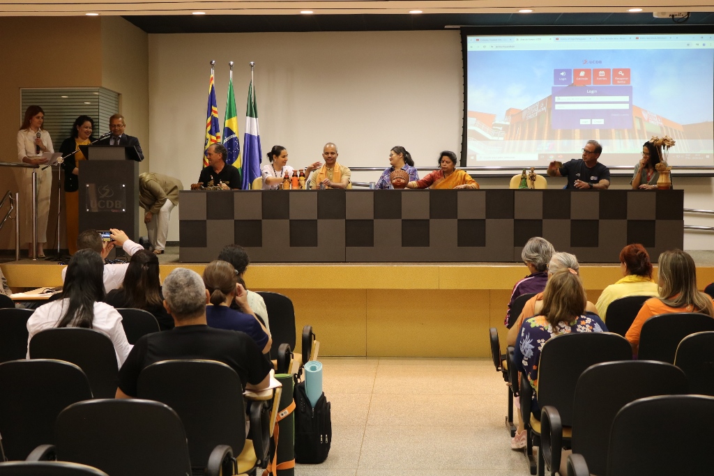 Acadêmicos dos cursos de saúde da Universidade Católica Dom Bosco (UCDB) prestigiaram na manhã desta quinta-feira (29), no auditório do bloco M, da abertura da imersão em ioga promovida pela Secretaria de Estado de Saúde (SES), em parceria com a Secretaria de Estado de Turismo, Esporte e Cultura (Setesc), Fundação de Desporto e Lazer de Mato Grosso do Sul (Fundesporte), Embaixada da Índia e Ioga para todos.