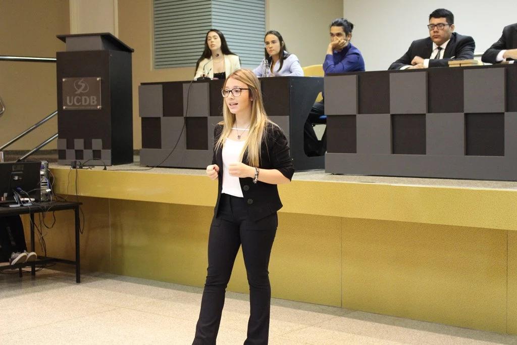 Acadêmicos do 2º semestre do curso de Direito da Universidade Católica Dom Bosco (UCDB) realizaram na quarta-feira (21) júri simulado, tendo como réu do julgamento a figura histórica Luís Bonaparte, conforme apresentado no livro “O 18 Brumário de Luís Bonaparte”, de Karl Marx. O evento foi realizado no anfiteatro do bloco M, utilizando um roteiro adaptado do Tribunal do Júri como estipulado no código de processo penal.