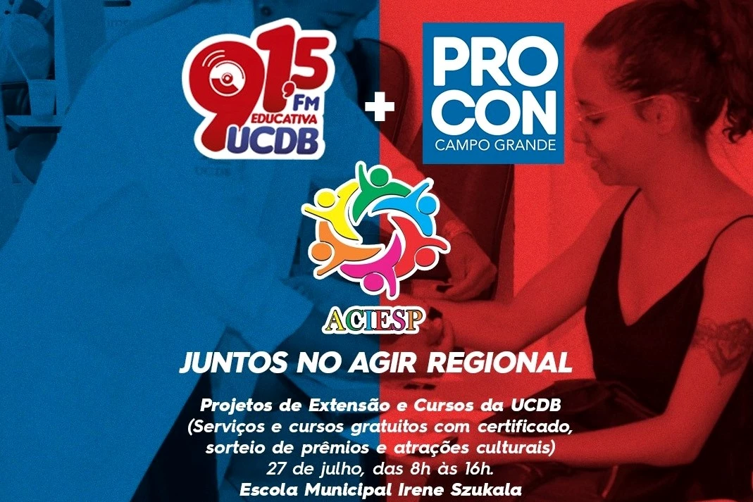 A FM Educativa UCDB 91,5 em parceria com a Superintendência para Orientação e Defesa do Consumidor em Mato Grosso do Sul (Procon-MS) realiza, neste sábado (27), mais uma edição do Agir Regional. A ação oferece diversos serviços gratuitos para a população, das 8h às 16h, na Escola Municipal Irene Szukala, localizada na Rua Lemanjá, nº 1025, Bairro Jardim das Hortênsias