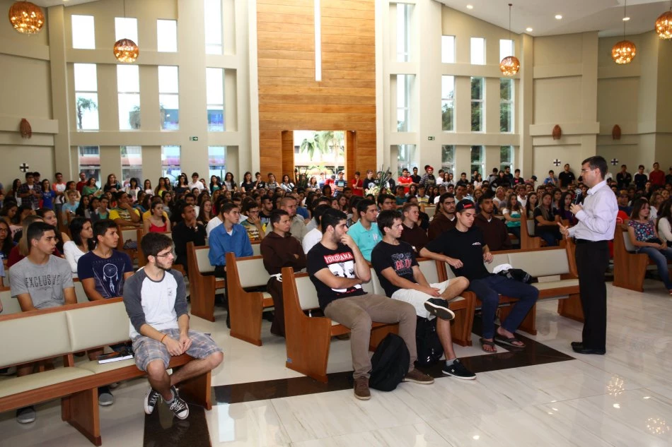 Dando continuidade à Acolhida 2016, o Reitor da Universidade Católica Dom Bosco, Pe. Ricardo Carlos, conversou, ontem (3), com os novos acadêmicos da Instituição, no local que é considerado o coração da universidade, a Igreja São João Bosco. Pela manhã, duas grandes turmas participaram da atividade e, no período da noite, todos os calouros tiveram a mesma oportunidade.
