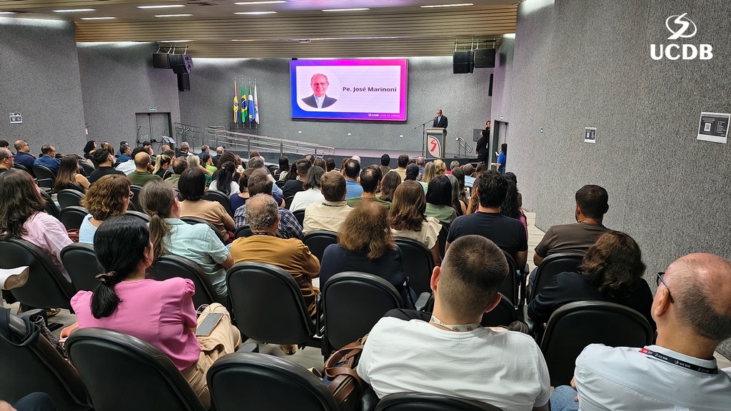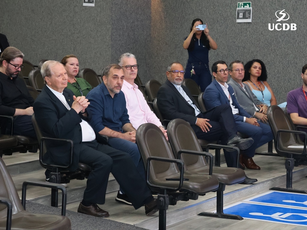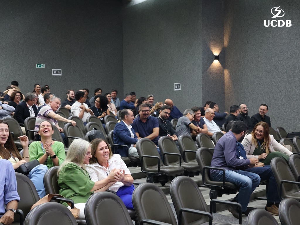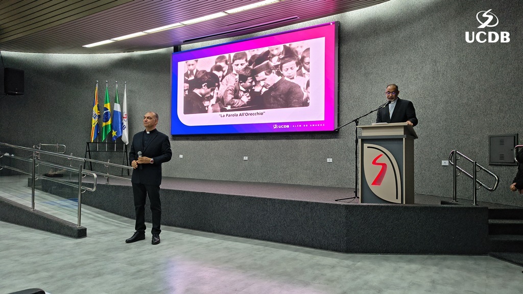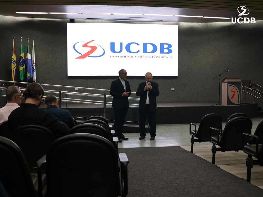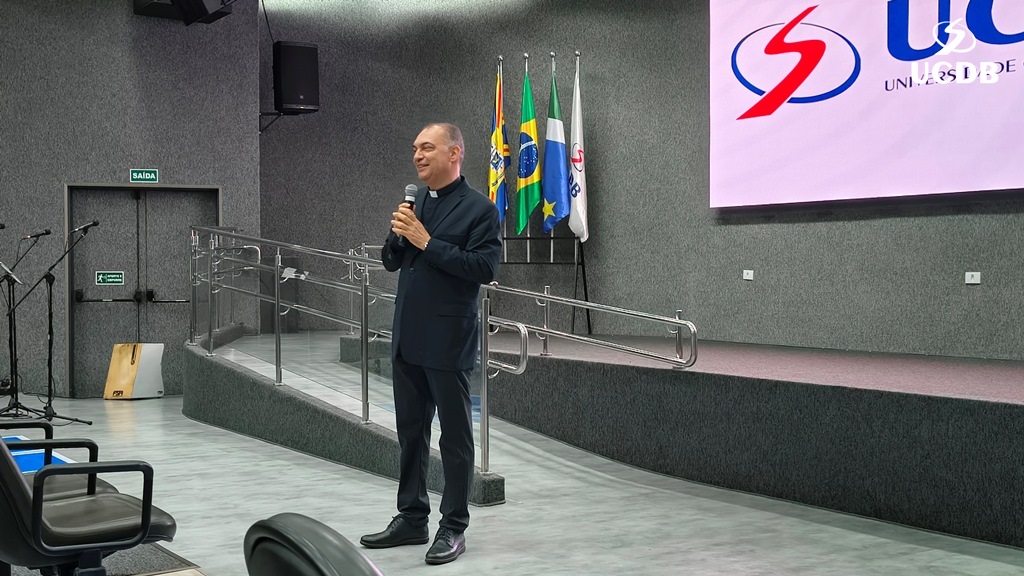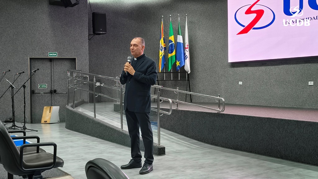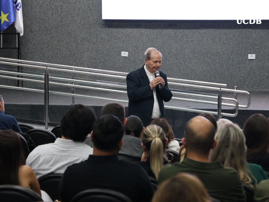 Pe. Elias também se apresentou, relatando um pouco de sua trajetória, com o nascimento, em Três Lagoas, a infância e juventude em Mato Grosso e a época da faculdade de Filosofia, no período de transição entre a Fucmt e a UCDB. “Retornar para a UCDB me faz viver um tempo de muitas recordações e recordações nos levam à gratidão. Lembro-me dos meus professores, cada um com seu jeito, mas todos marcaram minha vida. Foi nesse anfiteatro que colei grau. Vocês, professores, são educadores salesianos e eu aprendi que o salesiano é um educador-pastor, que guia, acolhe, repreende quando necessário. Que sua missão alcance o objetivo que vocês desejam. E reforço que a Pastoral é local de acolhida; a Pastoral tem o rosto da mãe, disponível a todos vocês. Que sejamos exigentes com ternura. Concluo relembrando a frase de Dom Bosco: Nossa vida é um presente de Deus para nós. O que fazemos, é o nosso presente para Ele”.