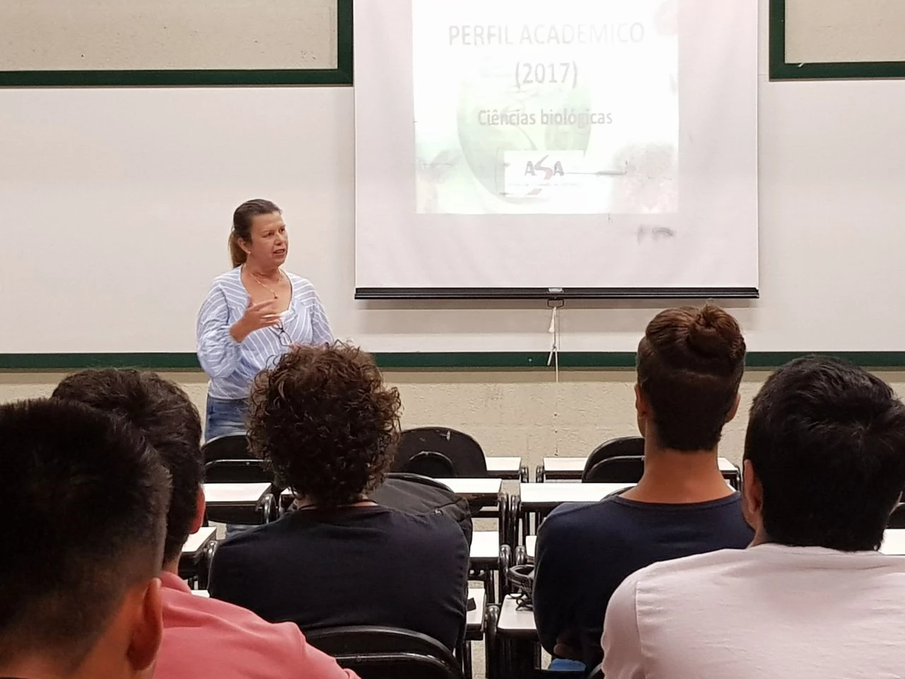 Professora Lucy expôs o resultado do levantamento feito em 2017 que indica as principais características dos alunos ingressantes em Ciências Biológicas no período noturno. “Percebemos que nesta sala em especial, com base no último estudo, há alunos que trabalham o dia todo e têm os estudos como o terceiro turno. Por isso, é necessário trabalhar a vitalidade do grupo que está muito ligada ao envolvimento que possuem com a graduação”, pontuou Lucy.