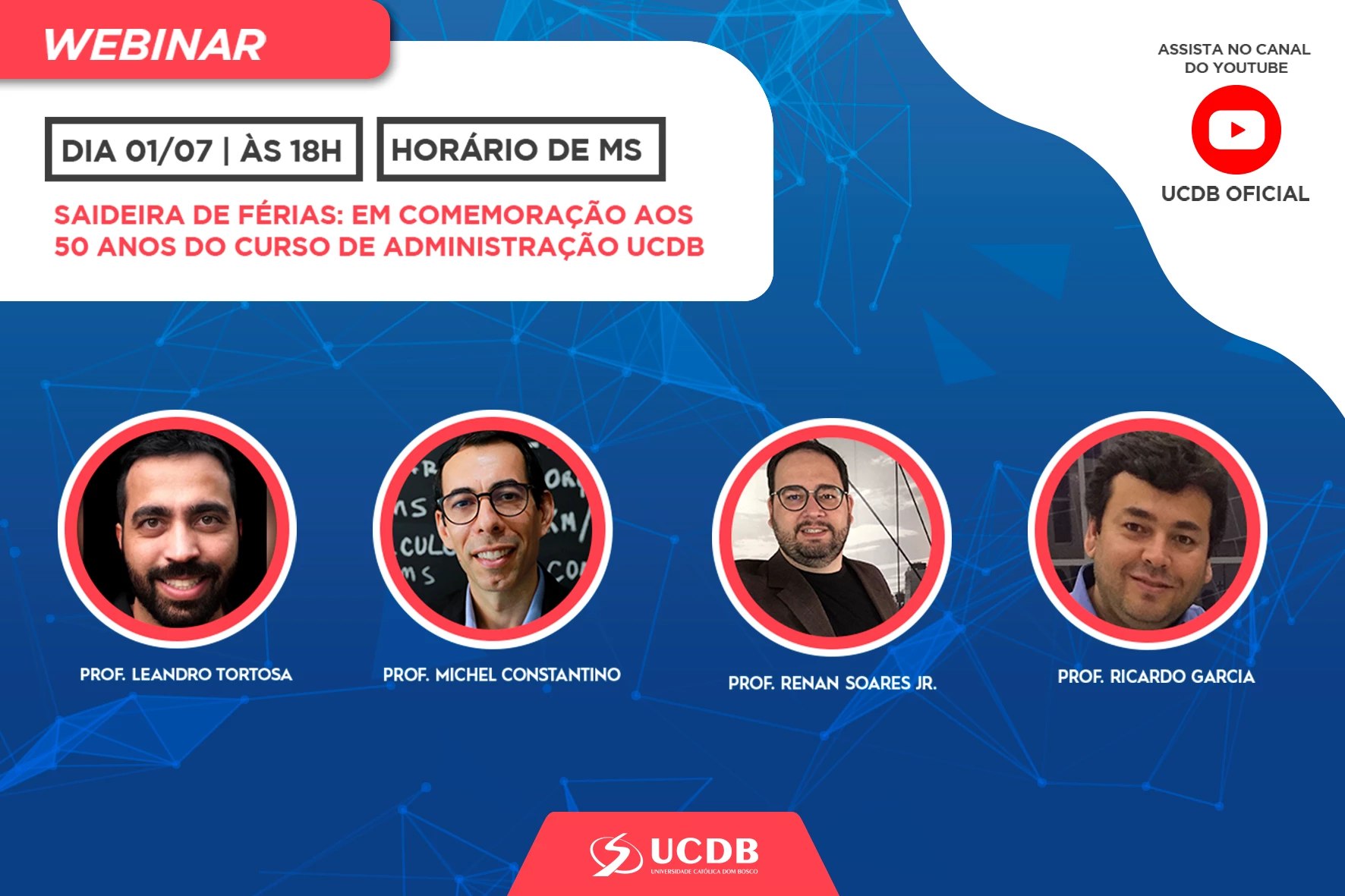 O evento terá a apresentação do coordenador do curso, Leandro Tortosa, e dos professores da UCDB Michel Constantino, Renan Soares Júnior e Ricardo Garcia. O tema será “Saideira de Férias: Fechando o semestre e preparando o retorno”. “Esse será o primeiro evento. Durante o segundo semestre vamos procurar entrevistar ex-professores e egressos e fazer algumas ações”, adiantou Tortosa.