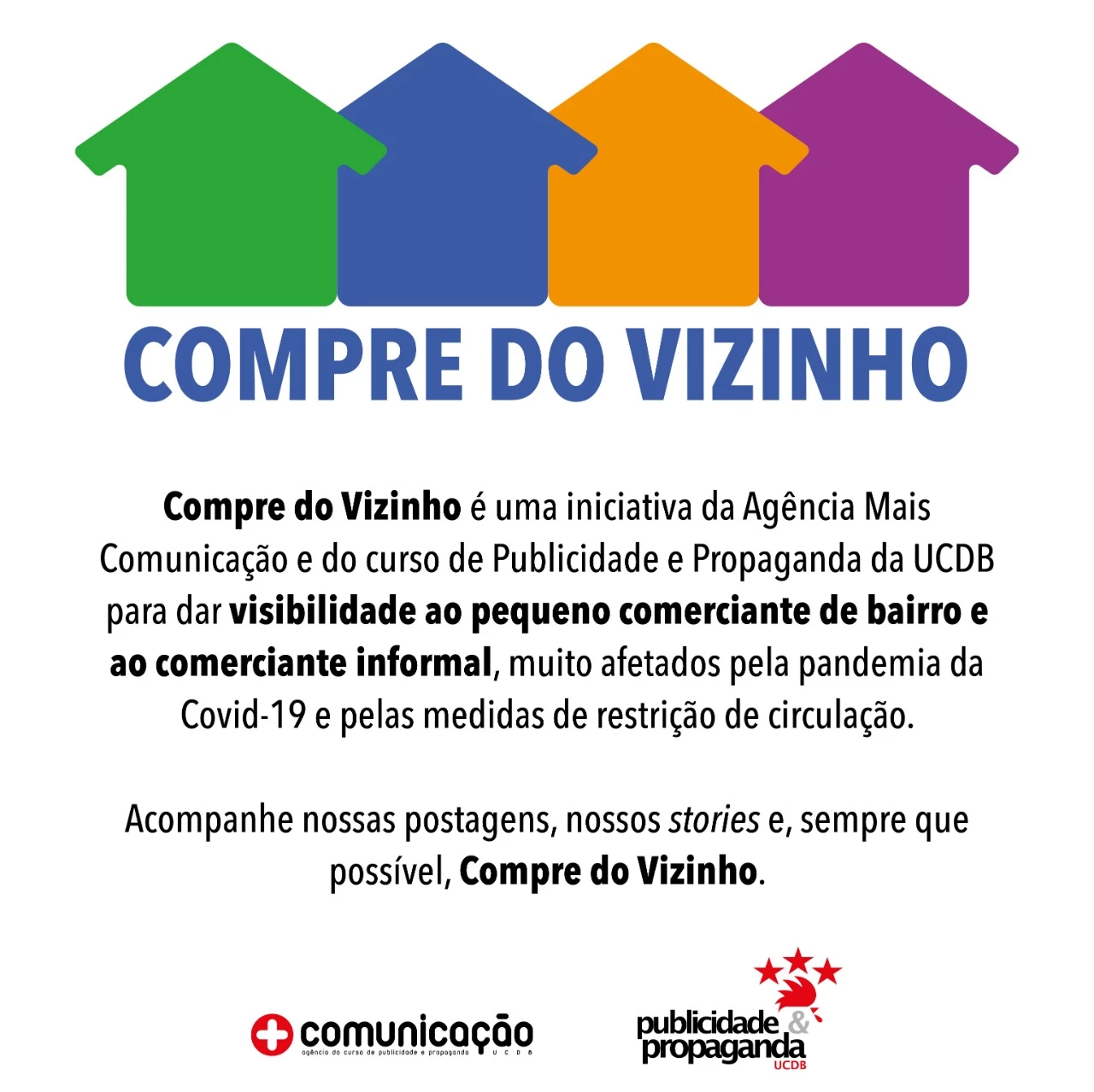 O laboratório de extensão ‘Agência Mais Comunicação’, do curso de Publicidade e Propaganda da Universidade Católica dom bosco (UCDB) está realizando a ação publicitária ‘Compre do Vizinho CG’, com intuito de divulgar gratuitamente nas redes sociais o pequeno comércio do bairro e motivar a população a não andar muito para ir comprar o que precisa.