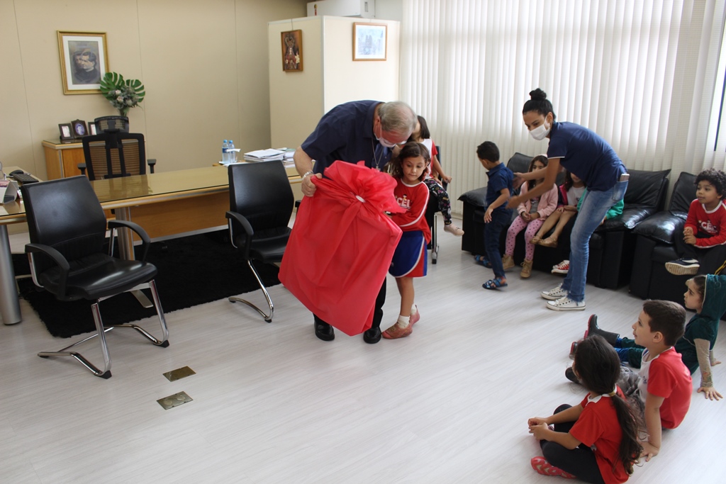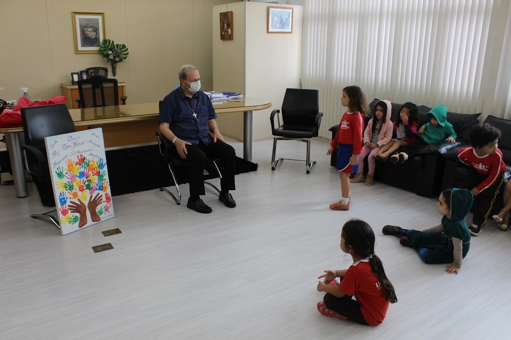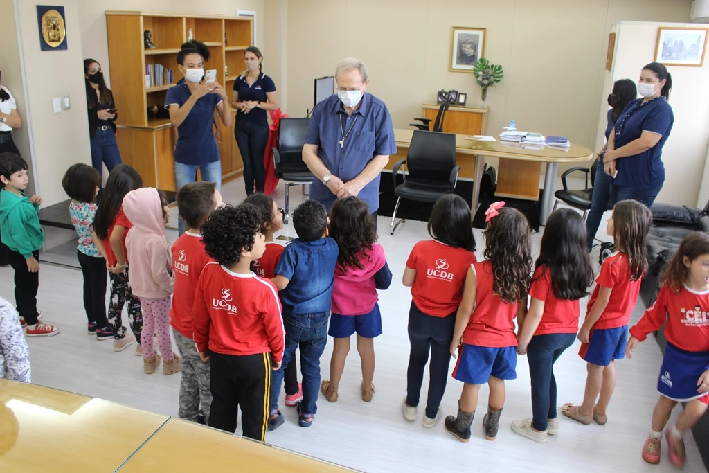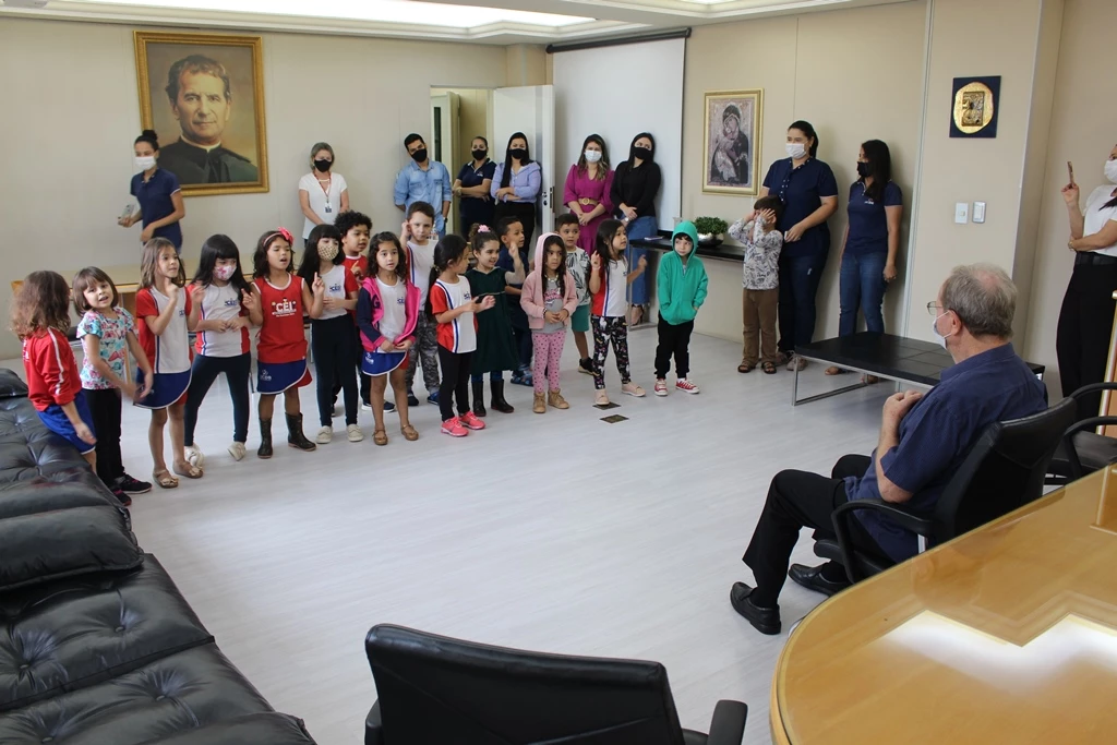 Os alunos do nível II do Centro de Educação Infantil São Domingos Sávio (CEI) da Universidade Católica Dom Bosco (UCDB) homenagearam o Reitor da Católica, Pe. José Marinoni, em razão de seu aniversário natalício. As crianças foram até a sala dele na Reitoria da Católica, cantaram, dançaram e o presentearam com um quadro feito por eles mesmos.