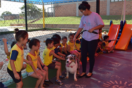 As crianças do CEI puderam brincar e conhecer mais do projeto e dos cães, e as possibilidades de terapia com animais. O Cão Terapeuta tem o objetivo de trabalhar com crianças com disfunções de habilidades sociais e disfunções cognitivas. O projeto conta com extensionistas dos cursos de Psicologia, Zootecnia, Medicina Veterinária e Fisioterapia.