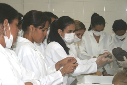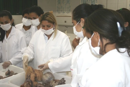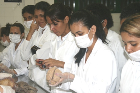 Devidamente uniformizados com jaleco e máscaras, nenhum deles parecia intimidado ao ver um cadáver dividido em peças. Compartilhando a atenção entre a aula e peças anatômicas, os estudantes analisavam curiosamente cada detalhe da anatomia.