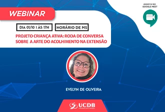 A Universidade Católica Dom Bosco (UCDB), por meio do projeto de extensão Criança Ativa, realiza nesta sexta-feira (1º), às 17 horas, a roda de conversa sobre a ‘Arte do acolhimento na Extensão’. A transmissão será via Google Meet e aberta a todos os extensionistas da Católica.