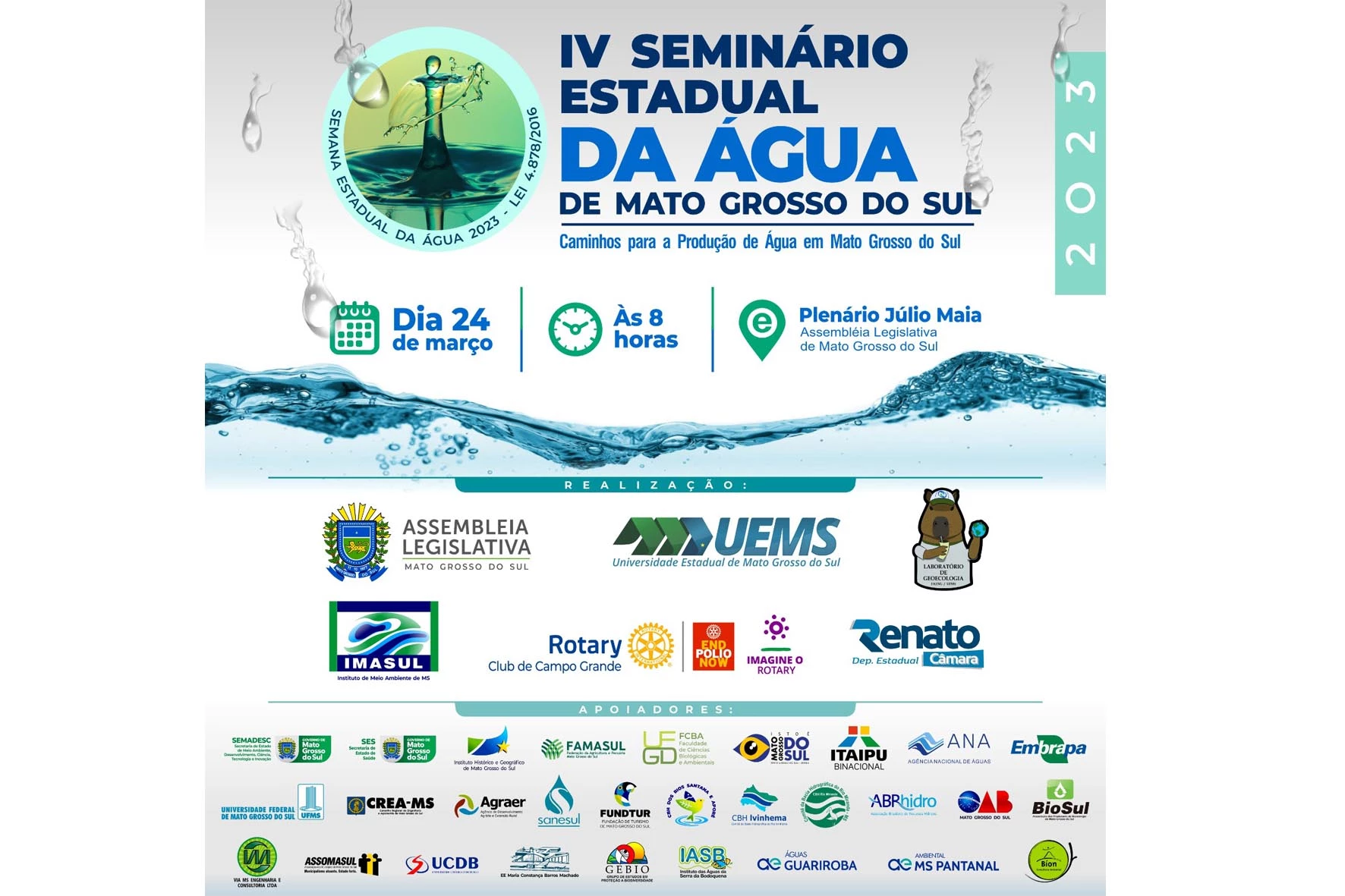 Dia 24 de março, a partir das 8h, acontece o IV Seminário Estadual da Água, na Assembleia Legislativa de Mato Grosso do Sul (ALEMS), com transmissão on-line. O evento tem o apoio da Universidade Católica Dom Bosco (UCDB) e o tema deste ano é “Caminhos para a Produção de Água em Mato Grosso do Sul”. As inscrições estão abertas no link.
