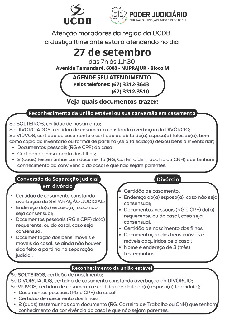O mutirão da Justiça Itinerante na Universidade Católica Dom Bosco (UCDB) será nesta sexta-feira (27), no Núcleo de Práticas Jurídicas da Católica, das 7h30 às 11h30, proporcionando atendimento jurídico gratuito para a população, como o reconhecimento de união estável e conversão em casamento, divórcio, guarda, pensão alimentícia, investigação de paternidade, entre outros. Para garantir o atendimento, é preciso agendar pelos telefones (67) 3312-3510 ou 3643.