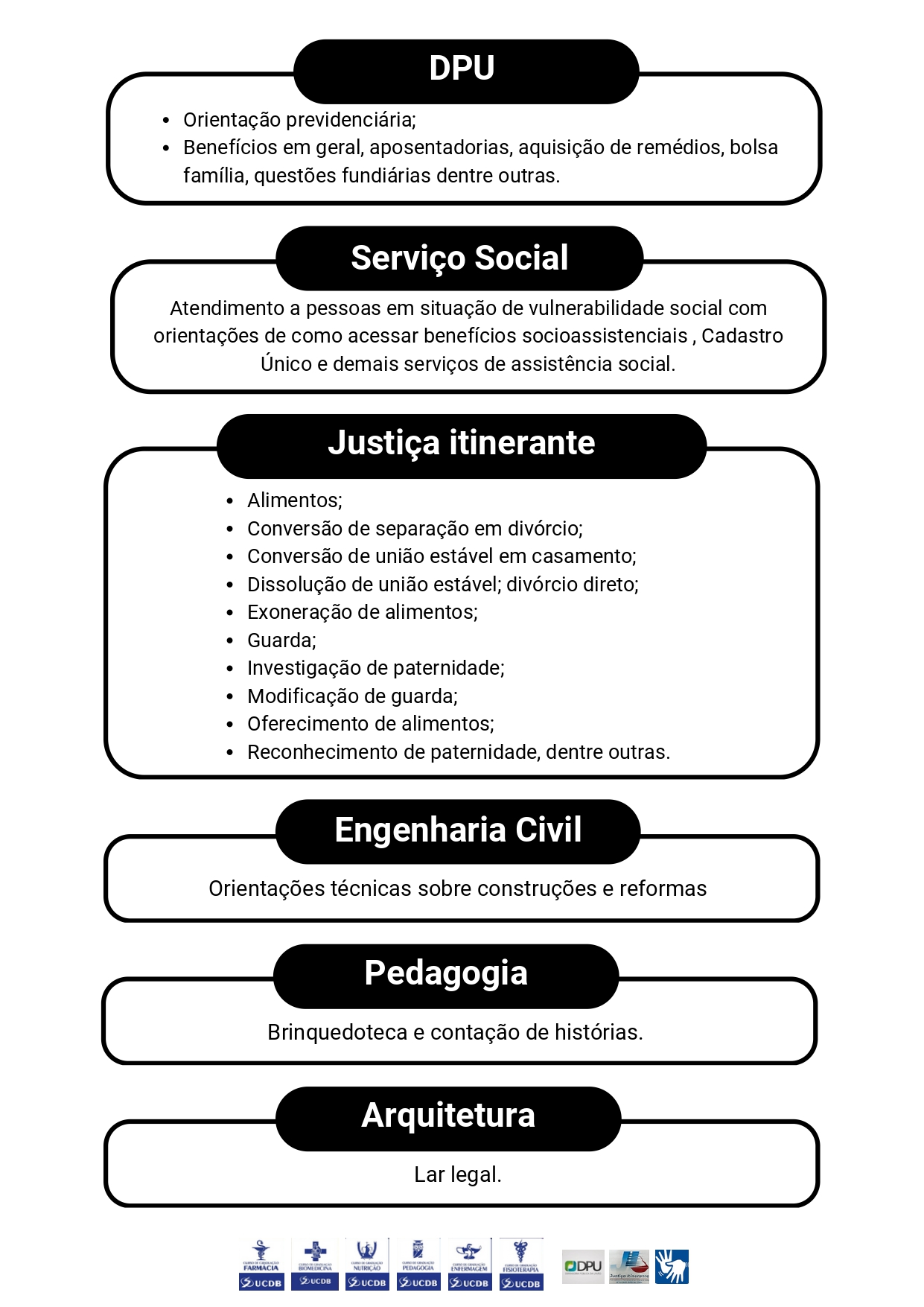 Também serão oferecidos serviços ligados aos cursos Biomedicina, Farmácia, Nutrição, Enfermagem, Fisioterapia, Serviço Social, Pedagogia, Arquitetura, Engenharia Civil, e também da ASA/NAP e Defensoria Pública da União, como acolhimento psicológico, interprete de libras, orientação previdenciária, aposentadorias, aquisição de remédios, bolsa família, questões fundiárias, hidratação facial, cuidados com a pele, aferição da pressão arterial, controle da glicemia, coleta de medicamentos vencidos ou em desuso, avaliação nutricional para uma alimentação saudável, consulta de enfermagem, coleta e preventivo, prevenção e tratamento de incontinência urinária, atendimento a pessoas em situação de vulnerabilidade social, brinquedoteca e dicas técnicas sobre construções e reformas.