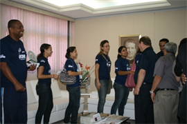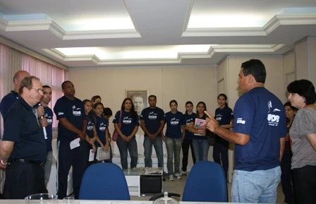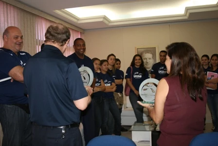 Atletas do futsal feminino, vôlei e judô da Universidade Católica Dom Bosco (UCDB) que participaram dos Jogos Universitários Brasileiros (JUBs), disputado em Santa Catarina, visitaram o Reitor, Pe. José Marinoni, e os pró-reitores Ir. Raffaele Lochi (Administração), Conceição Aparecida Butera (Ensino e Desenvolvimento), Hemerson Pistori (Pesquisa e Pós-Graduação) e Luciane Pinho de Almeida (Extensão e Assuntos Comunitários), ontem pela manhã.