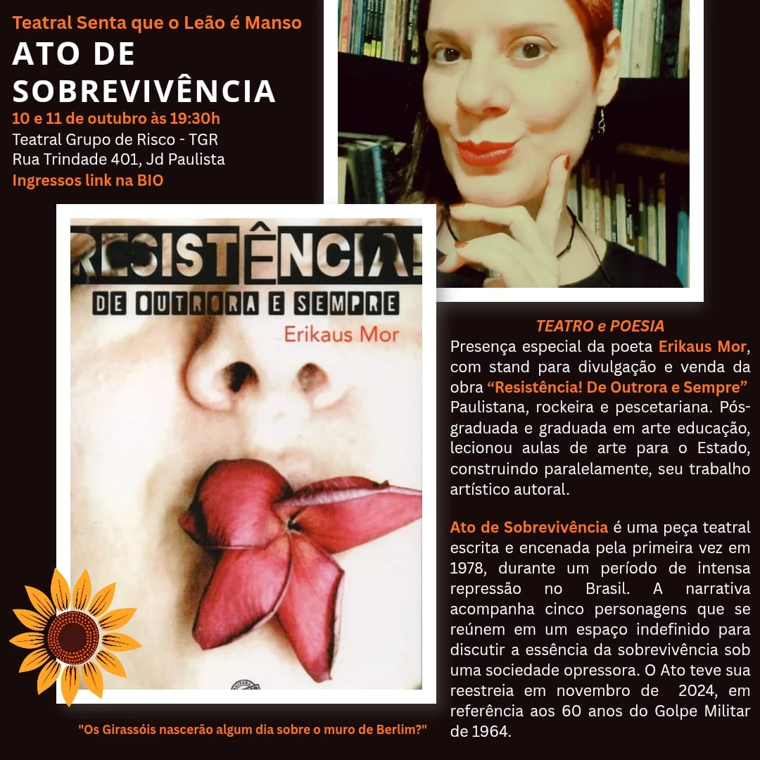 A peça “Ato de Sobrevivência”, encenada pelo grupo teatral Senta que o Leão é Manso, da Universidade Católica Dom Bosco (UCDB), volta aos palcos com duas novas sessões, nos dias 10 e 11 de outubro, às 19h30, no Teatral Grupo de Risco (TGR), localizado na Rua Trindade, 401, Jardim Paulista, em Campo Grande (MS). Os ingressos estão disponíveis a preços populares, clicando aqui, sendo que toda a renda será revertida ao TGR, contribuindo para a manutenção do espaço e apoio às ações culturais promovidas pelo grupo.
