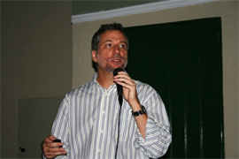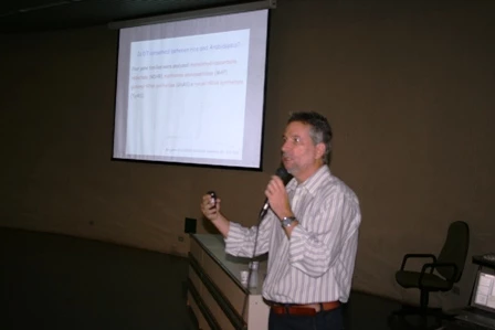 Durante a aula magna, o docente discorreu sobre o transporte intracelular de proteínas, área na qual tem vasta experiência como docente e editor chefe da revista “Genetics and Molecular Biology”.