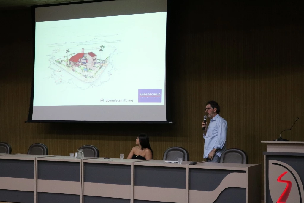 Rubens Fernando de Camilo, graduado em 1985 pela Universidade Mackenzie, filho de família tradicional ligada à arquitetura, tem projetos e obras realizadas para variados segmentos do mercado. “Geralmente quem procura arquiteto ele está procurando para realizar o sonho da vida dele, que muitas vezes é um momento sublime de uma família que se organizou durante anos e que finalmente vai realizar o sonho de construir uma casa. Por isso vocês veem a responsabilidade que nós temos em atender essas pessoas”, destacou o palestrante.