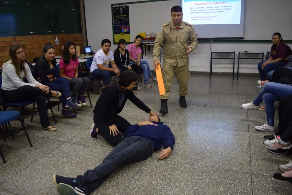 Com o intuito de preparar os acadêmicos de Enfermagem a lidar com situações de emergência, na manhã de sexta-feira (20), eles participaram de uma aula prática em atendimentos básicos de saúde ministrada pelo bombeiro Marcelo Sampaio.