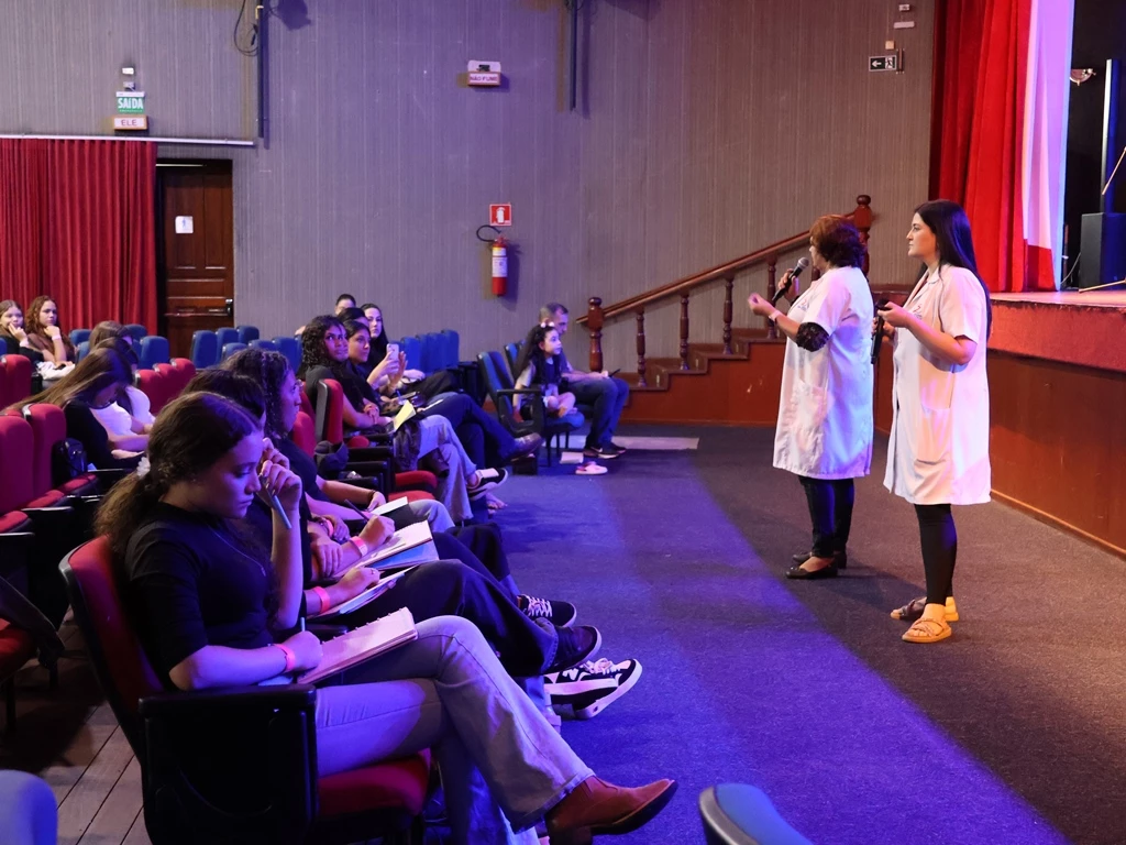 A professora do curso de Psicologia da UCDB, Eliny Aparecida Vargas Machado Salazar conversou com os alunos sobre o controle da ansiedade para a prova e nutricionista Gislayne Miranda deu dicas sobre os cuidados com a alimentação pré-Enem.