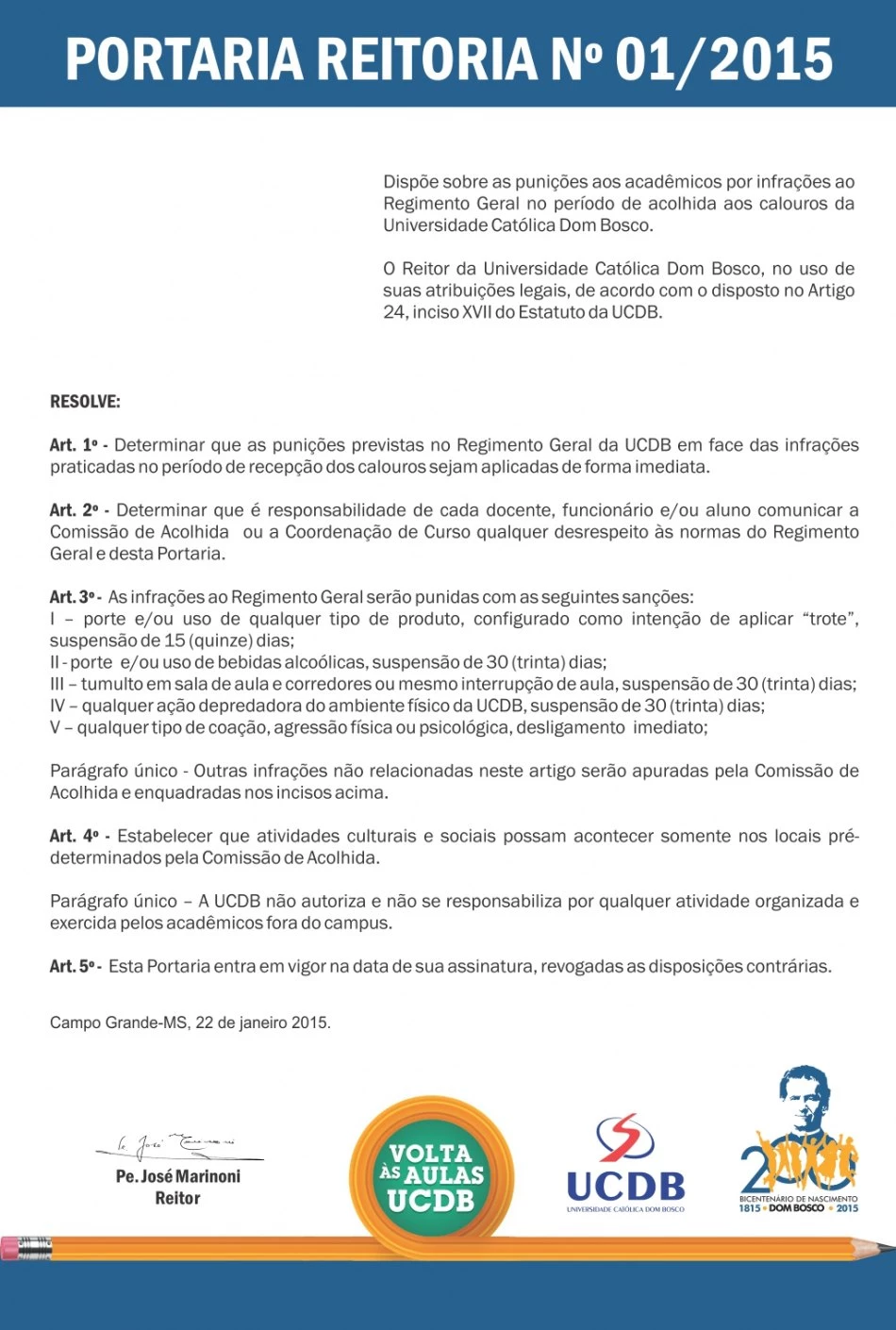 O Reitor da UCDB, Pe. José Marninoni, assinou a Portaria 01/2015 que dispõe sobre as punições aos acadêmicos por infrações ao Regimento Geral no período de acolhida aos calouros, que pode ser lida clicando na imagem acima.