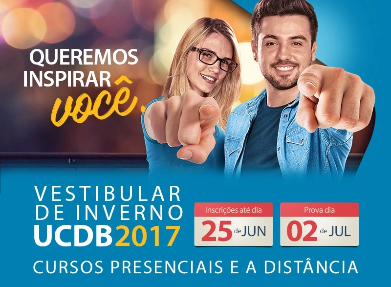 As inscrições para o Vestibular de Inverno da UCDB estão abertas e devem ser feitas exclusivamente pelo site www.ucdb.br/vestibular até 25 de junho. A prova será aplicada no domingo (2/7), às 8h, no campus da Avenida Tamandaré.