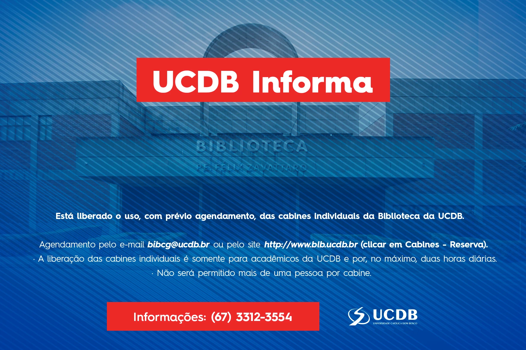 A Biblioteca Pe. Felix Zavattaro, da Universidade Católica Dom Bosco (UCDB), além do agendamento dos empréstimos de material pela internet, passa agora a liberar o uso de cabines exclusivamente para acadêmicos da Instituição realizarem seus estudos. O uso deve ser agendado via Pergamum/Cabines ou solicitado pelo e-mail bibcg@ucdb.br, restrito a uma pessoa por cabine, com permanência de até duas horas por dia. Por enquanto, respeitando as normas de biossegurança, a visitação e consulta local ainda não está permitida.