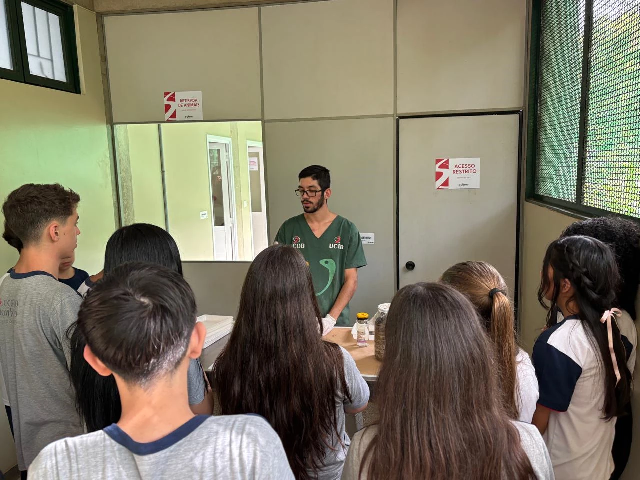 Nesta semana, alunos do 7º ano do Colégio Dom Bosco visitaram o Biotério da Universidade Católica Dom Bosco (UCDB). Os alunos do período matutino conheceram o local na terça-feira (5) e os do período vespertino, na quarta-feira (6). Os estudantes foram acompanhados por professores de Biologia da escola e, na UCDB, receberam as informações de acadêmicos de Biologia e de Medicina Veterinária, que apresentaram a estrutura e os animais do local.