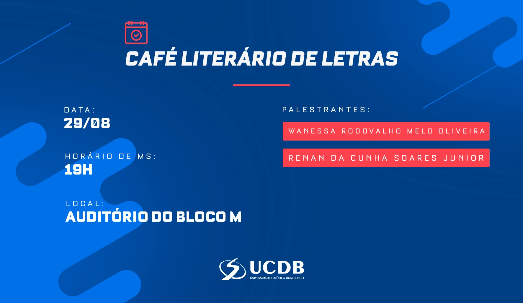A Universidade Católica Dom Bosco (UCDB), por meio do curso de Letras, realiza nesta segunda-feira (29), às 19h, no auditório do bloco M, mais uma edição do Café Literário.