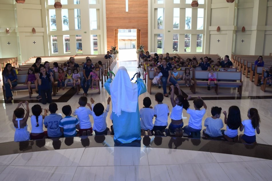 Os colaboradores da Pró-Reitoria de Pastoral promoveram uma celebração em homenagem ao mês do rosário, comemorado em outubro. As crianças do Nível III prepararam uma apresentação sobre esse tema, onde usaram rosários, cantaram e uma das alunas se vestiu de Maria, mãe de Jesus.