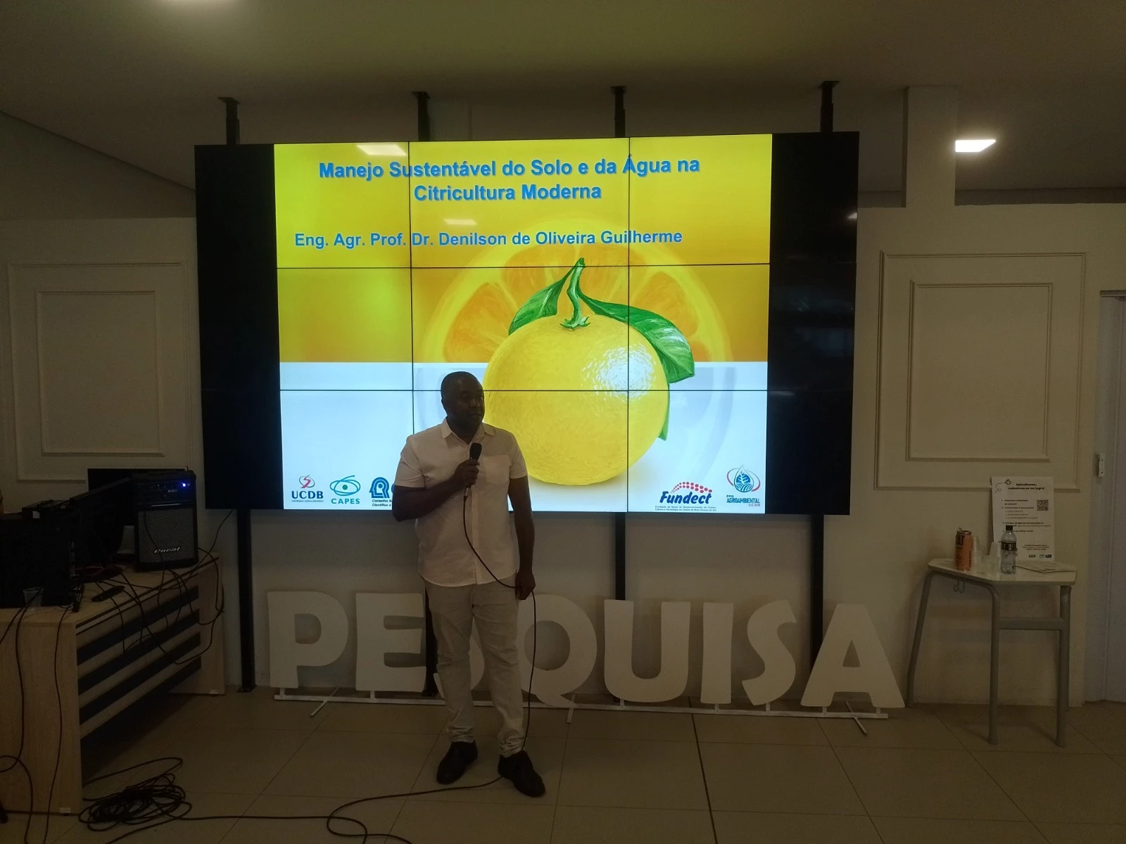 Entre os palestrantes, estava o professor Denilson de Oliveira Guilherme, coordenador do Programa de Pós-graduação em Mestrado e Doutorado da UCDB, que abordou o tema “Manejo Sustentável do Solo e da Água na Citricultura Moderna”, destacando técnicas de conservação aliadas à eficiência produtiva.