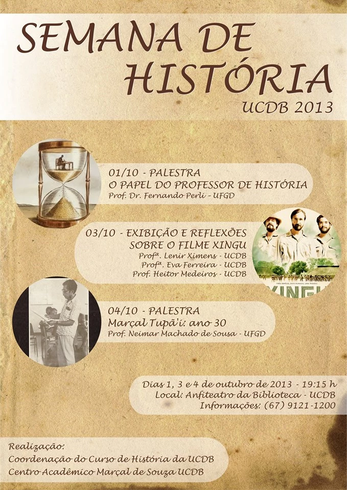 Começa hoje (1º), na Universidade Católica Dom Bosco, a Semana de História 2013, promovida pela coordenação do curso e pelo Centro Acadêmico Marçal de Souza UCDB. A primeira atividade será a palestra O papel do professor de História, com o professor Dr. Fernando Perli, da Universidade Federal da Grande Dourados. O evento será a partir das 19h15, no anfiteatro da Biblioteca Pe. Félix Zavattaro.