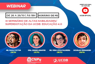 A Universidade Católica Dom Bosco (UCDB) dá início nesta segunda-feira (26), a partir das 18h, ao III Seminário de Altas Habilidades/Superdotação da UCDB: Educação 4.0. O evento, com transmissão ao vivo pelo YouTube oficial da UCDB, vai até a próxima quinta-feira (29), destinado para acadêmicos dos cursos de Psicologia, Pedagogia, Engenharia e Biologia, além de estudantes do ensino médio e professores do ensino fundamental e médio.