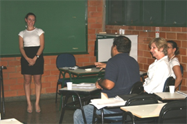 A primeira apresentação foi da acadêmica Bruna Moura, com o trabalho “O Design no Jogo Erótico”, orientado pela professora Me. Denise Nachif e avaliado pelos professores Me. José Francisco Sarmento e Esp. Maria Helena Benites, que formaram a banca examinadora.