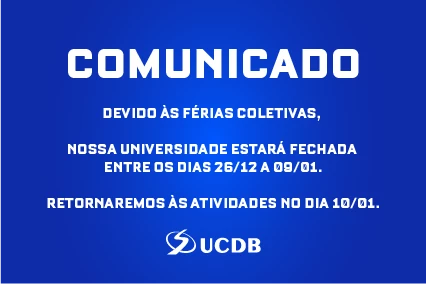 A UCDB informa que, entre os dias 23 de dezembro e 9 de janeiro, a universidade se encontra no período de férias coletivas. Desta forma não realizaremos atendimento em nenhum de nossos canais.