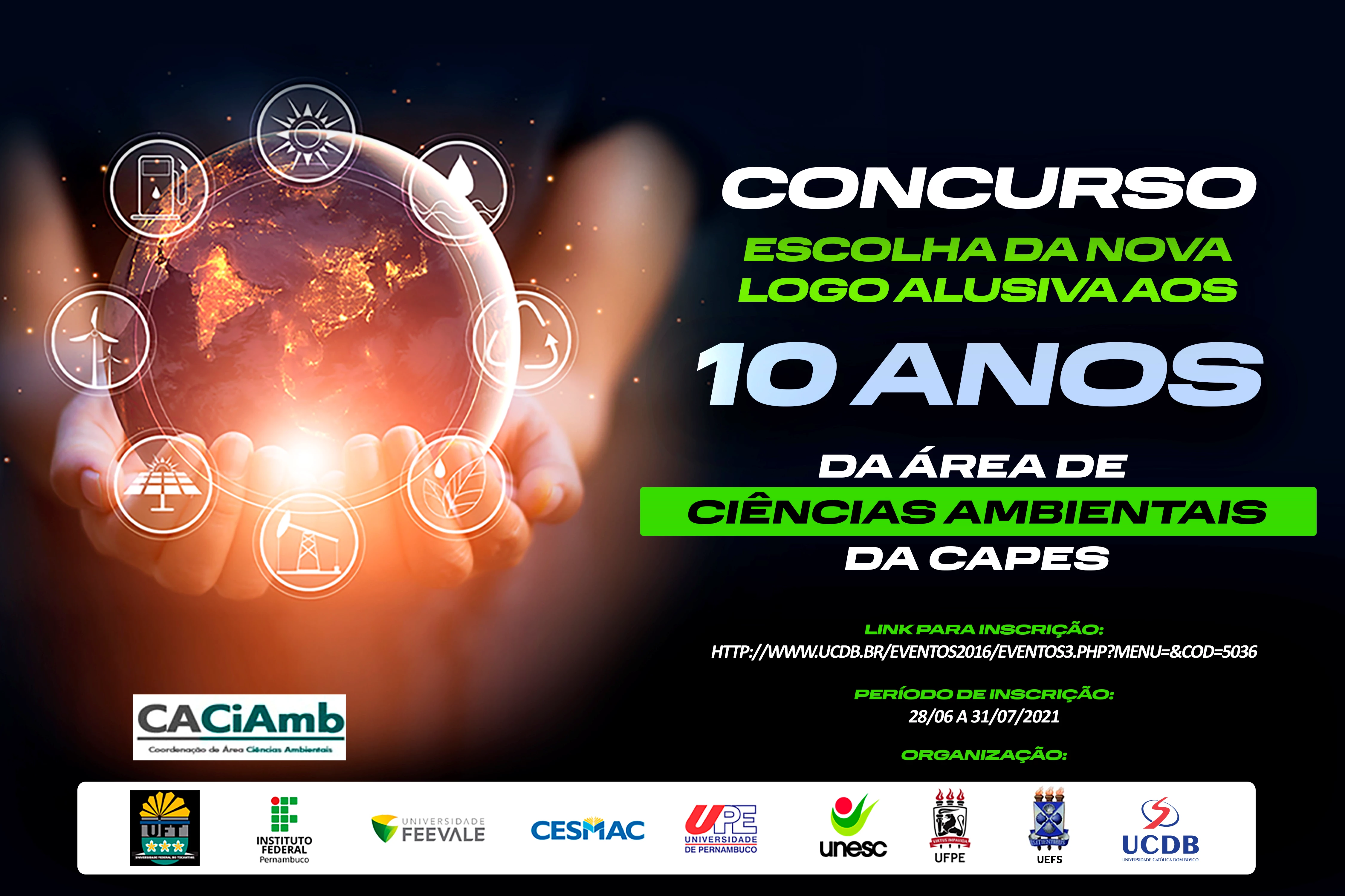 Em comemoração aos 10 anos de criação da área de Ciências Ambientais da Coordenação de Aperfeiçoamento de Pessoal de Nível Superior (Capes) está sendo realizado até o dia 31 de julho o concurso que vai escolher logomarca alusiva, que será utilizada na divulgação de eventos. Segundo a Comissão Organizadora do concurso Área de Ciências Ambientais (CaCiamb), podem participar professores, alunos e egressos do curso de pós-graduação em Ciências Ambientais enviando apenas uma sugestão. O link de inscrição pode ser acessado clicando aqui.