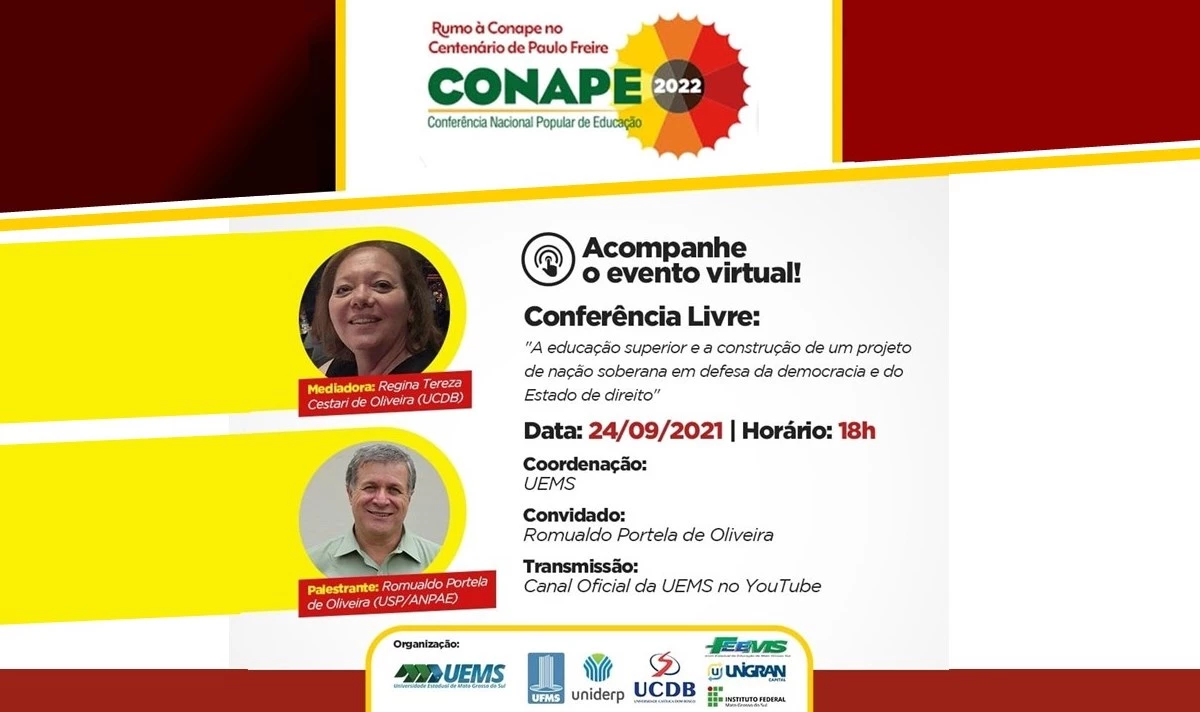 ‘A educação superior e a construção de um projeto de nação soberana em defesa da democracia e do Estado de direito’ é o tema da conferência on-line que será realizada na próxima sexta-feira (24), às 18 horas, com transmissão pelo canal oficial da Universidade Estadual de Mato Grosso do Sul (UEMS) no YouTube. A Universidade Católica Dom Bosco (UCDB) é uma das organizadoras do evento, que ocorre em preparação para a Conferência Nacional Popular de Educação (Conape) 2022 no Centenário de Paulo Freire, que acontecerá em Natal, no Rio Grande do Norte.