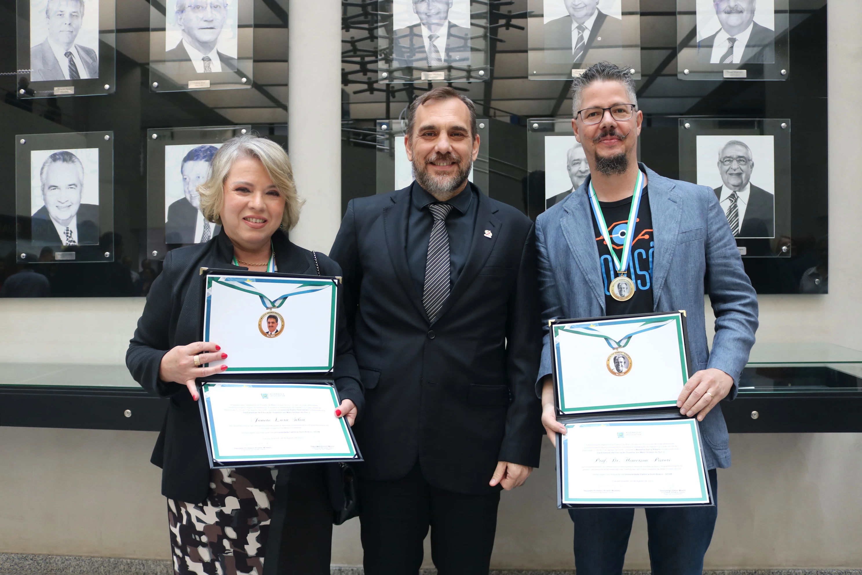 Os colaboradores Janete Lara Silva e Hemerson Pistori receberam, na tarde de ontem (28), a comenda Pedro Pedrossian e a medalha Darcy Ribeiro, respectivamente, por toda contribuição para educação superior, em especial para a Universidade Católica Dom Bosco (UCDB) — Instituição na qual trabalham há décadas. As homenagens foram entregues em cerimônia realizada na Assembleia Legislativa, com a participação do Reitor em exercício da UCDB Taner Douglas Bitencourt.