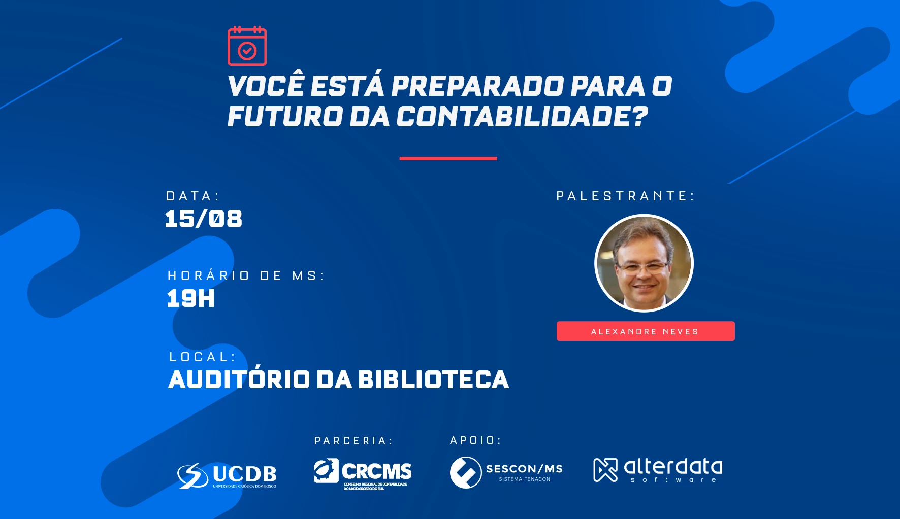 A Universidade Católica Dom Bosco (UCDB), por meio do curso de Ciências Contábeis, promove na próxima segunda-feira (15), às 19h, no auditório da Biblioteca Pe. Félix Zavattaro, a palestra ‘Você Está Preparado para o Futuro da Contabilidade?’, ministrada por Alexandre Neves. Evento, que é gratuito e aberto ao público, conta com parceria do Conselho Regional de Contabilidade de Mato Grosso do Sul (CRC/MS), e apoio da Sindicato das Empresas de Serviços Contábeis e das Empresas de Assessoramento, Perícias, Informações e Pesquisas no Estado de Mato Grosso do Sul (Sescon/MS) e Alterdata Software.