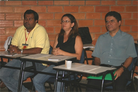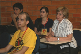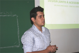 Encerrando a programação, Arlindo Alves Machado e Vinícius Sandoval apresentaram o trabalho intitulado “Design junto à acessibilidade”, com enfoque principal em deficientes visuais. Na banca examinadora estavam presentes os professores Me. José Francisco Sarmento, Esp. Maria Helena Benites - orientadora do trabalho - além de José Aparecido, deficiente visual.