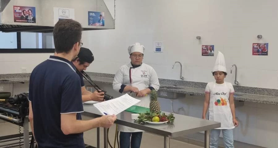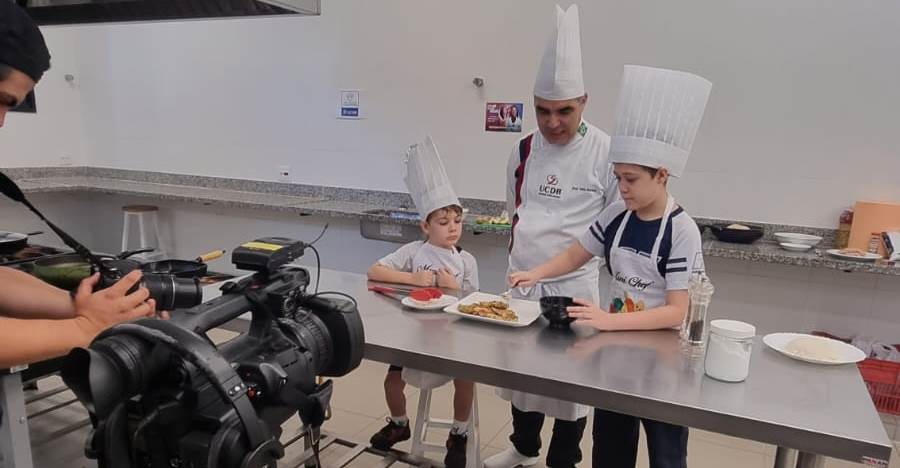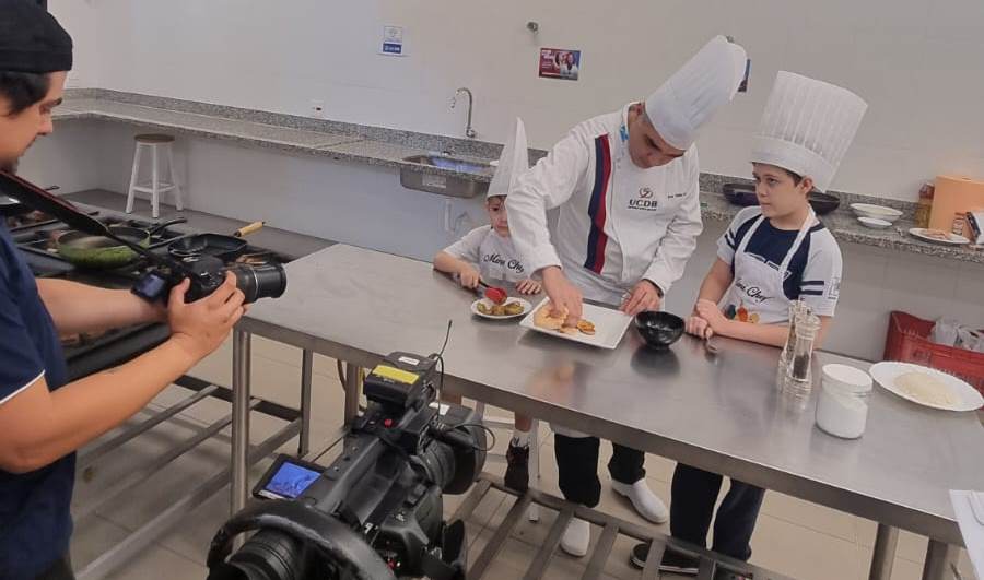 A gravação começou logo cedo na quarta-feira (10), com o auxílio dos papais, que trouxeram os filhos para o campus sem que as mamães pudessem imaginar a participação. A cozinha principal do Pátio UCDB se transformou em um verdadeiro cenário daqueles programas famosos de culinária. O acadêmico Tiago Ueno e a egressa Márcia Benites também ajudaram no preparo dos pratos e instruíram as crianças: Alice, Bernardo e Heitor.